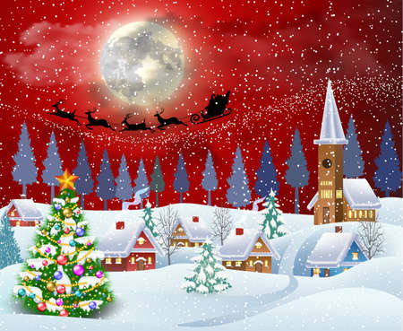 クリスマス ツリーとクリスマス風景と 背景に月 そりで空飛ぶサンタ クロースのシルエット グリーティング カードや郵便局のカード ベクター グラフィックの概念のイラスト素材 ベクタ Image