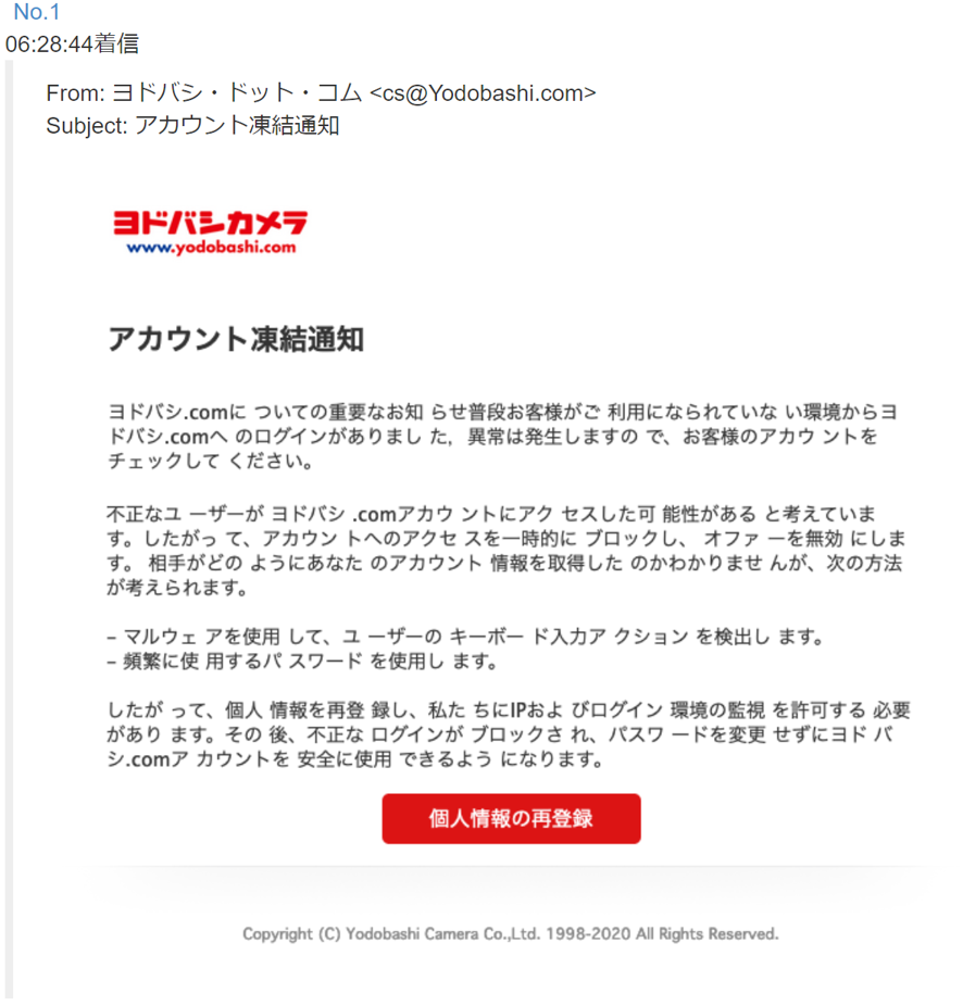 Naomi Suzuki ヨドバシカメラの通販サイトを装うフィッシングメールが アカウント凍結通知 という件名で昨日からばらまかれているそうです アカウントの再登録を求め偽サイトへと誘導するのでご注意ください 昨日の誘導先はお亡くなりになりましたが