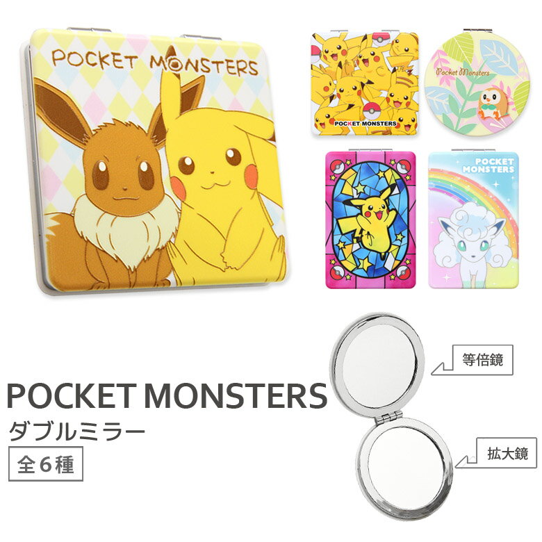 ポケットモンスター 拡大鏡付き ダブルミラー ピカチュウ モクロー イーブイ 黄色 ミミッキュ ピンク アローラロコン コンパクト 小物 カワイイ 化粧雑貨 コスメ 丸型 四角型 ゆるかわ アニメ キャラクターグッズ 手鏡 四角なんでもコーナー