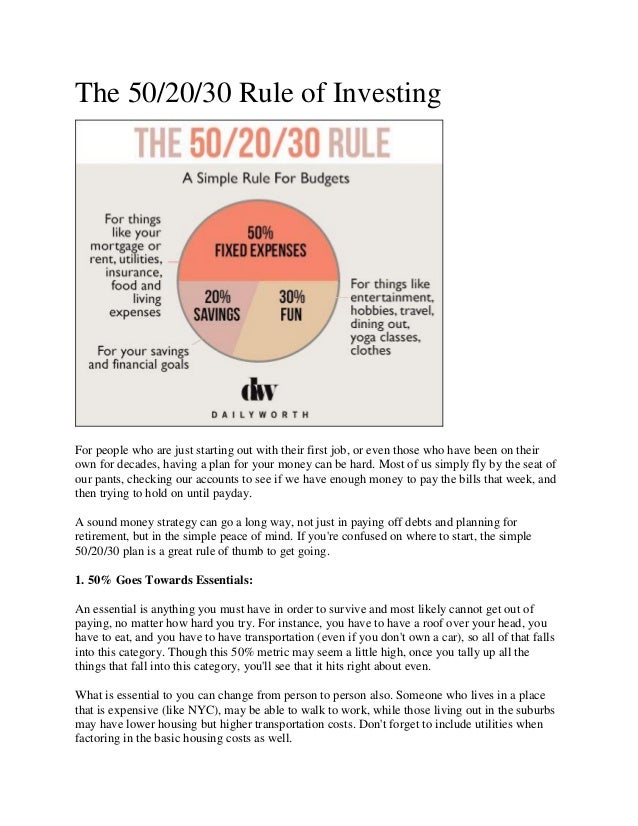 The 50/30/ rule is a budgeting framework that outlines what percentage of your income to allocate for the three of the most important parts of your budget. Fixed Costs (50%) – These are the expenses most vital to your survival, which don't vary from month to month:. But a successful budget means you have a grasp on what you’re spending your money on and what you’re saving for.